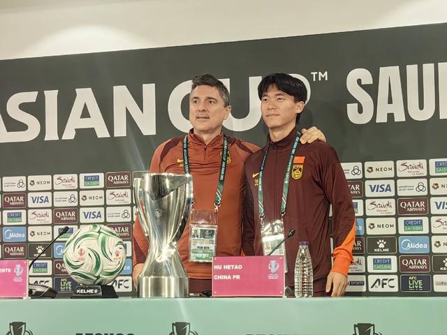 懂球帝记者 现场报道,北京时间1月23日,U23亚洲杯决赛中国vs日本的赛前新闻发布会在吉达阿卜杜拉-费萨尔王子体育场进行。中国队主教练安东尼奥携球员胡荷韬出席。